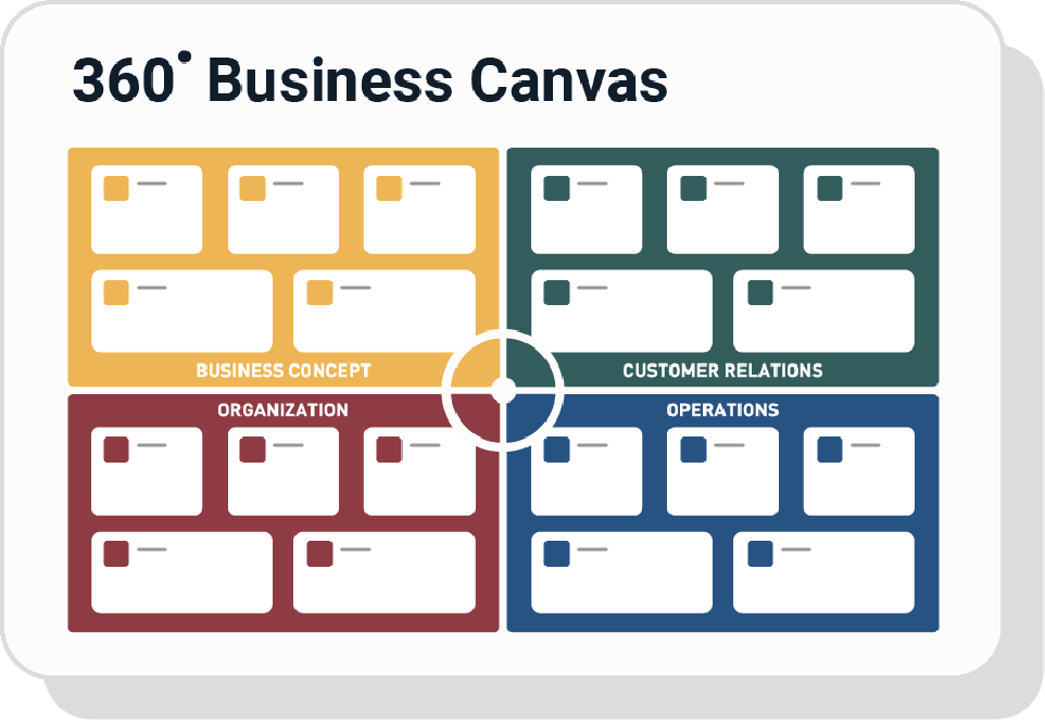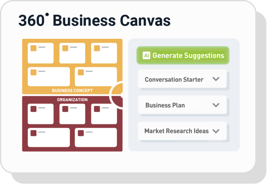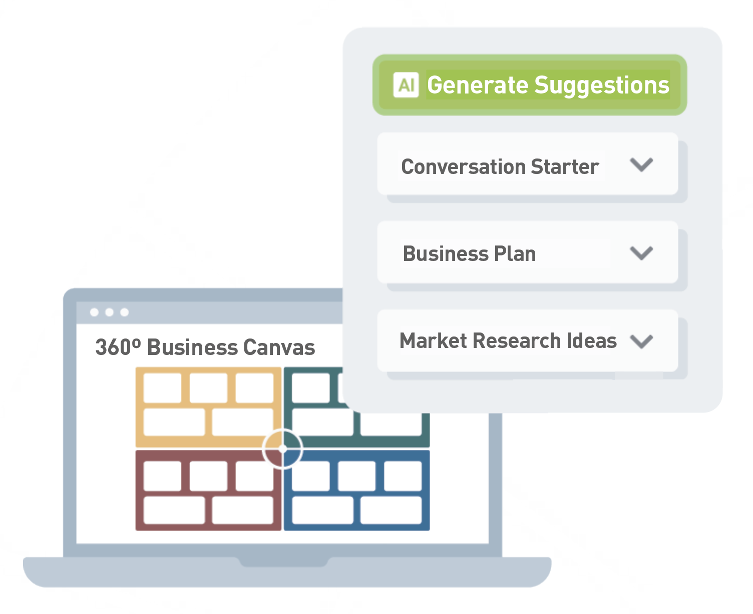 Upload a 360° Business Canvas and generate conversation starters, a business plan, or market research ideas—tailored to your client's needs.