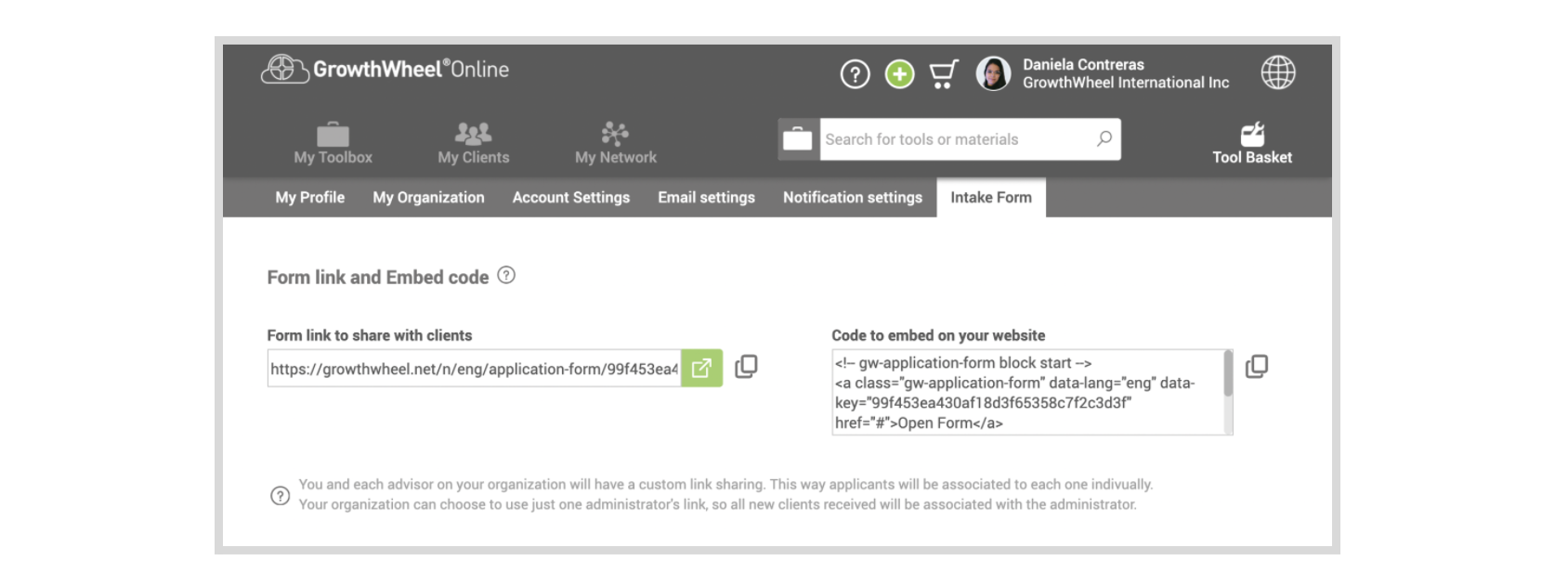 Find your custom link sharing on the new "Intake Form" submenu under your “Profile Settings” menu. Each advisor on GrowthWheel Online will have a unique link to share. This way, all clients signed up using their link will be associated with them immediately.